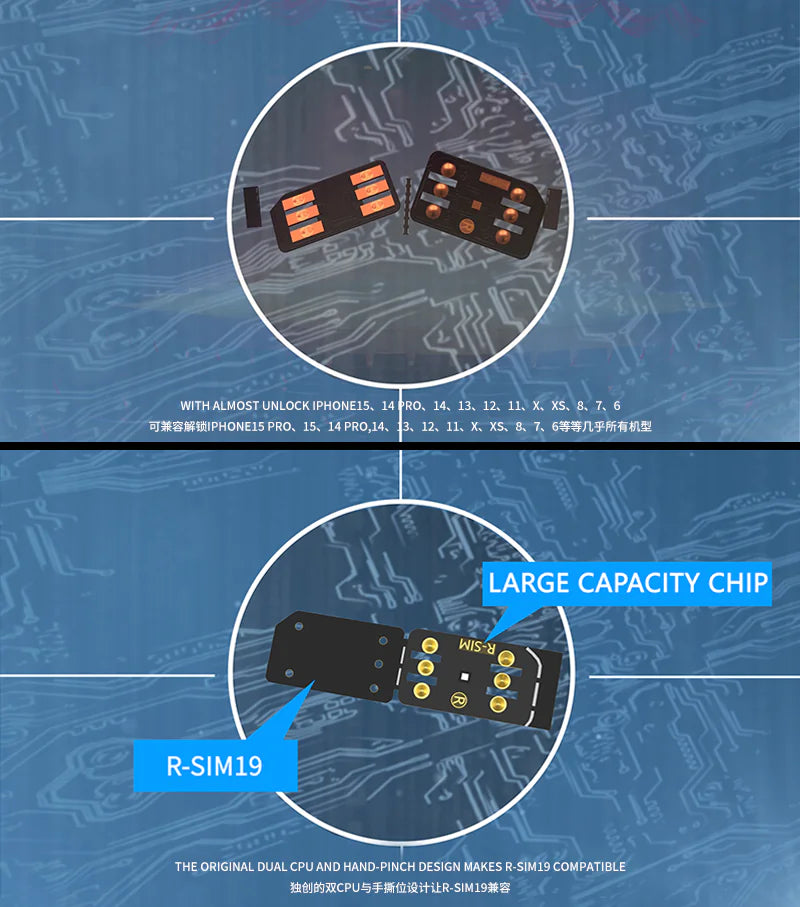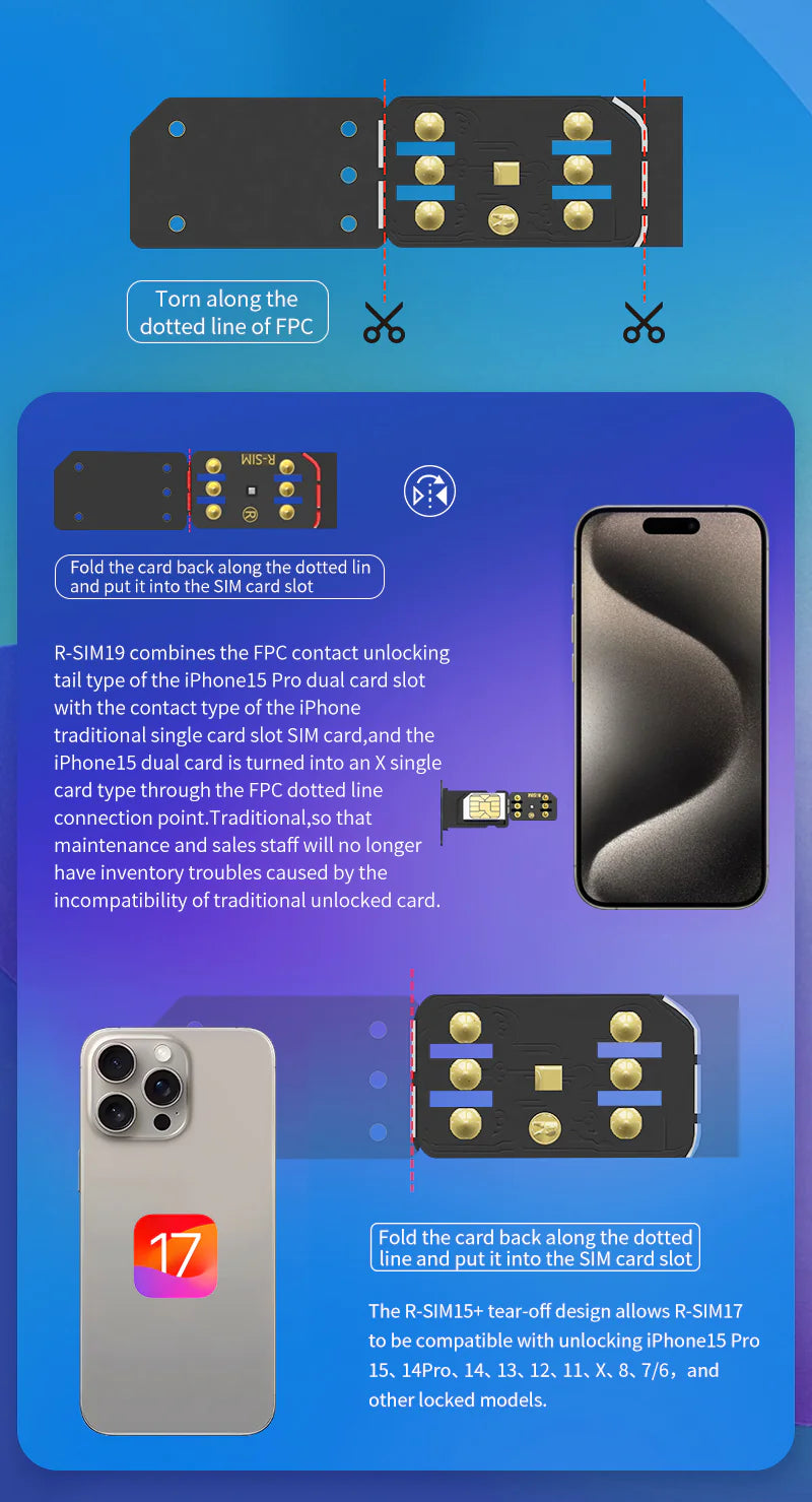 - R-SIM19 adds the sim card and mobile phone identity information in the upper left corner of the SIM Application, prompt to unlock user's information and parameters. The new R-SIM19 can unlock the iPhone 15 Pro max/15PRO/15/14/13 and almost every other iOS17 operating system on the market.